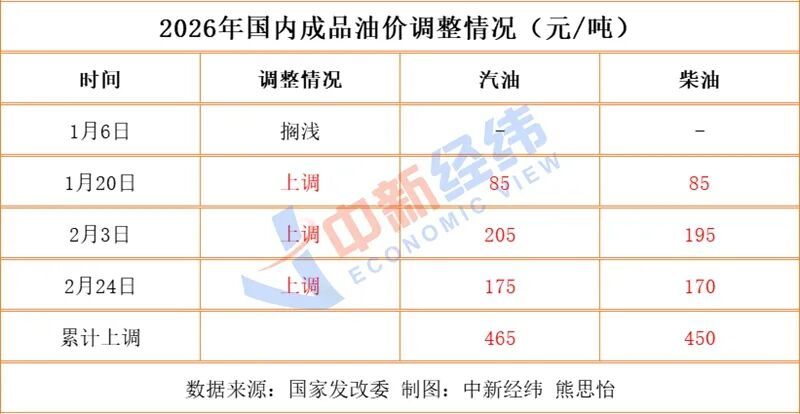 中新经纬注意到,今年以来,国内油价已经历四轮调价窗口,总体格局为“三涨一搁浅”。若本轮调价如预期上调,2026年调价格局将变为“四涨一搁浅”,也是年内连续第四次涨价。