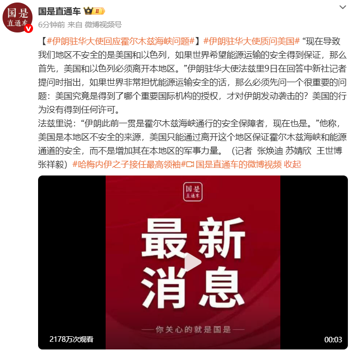 伊朗驻华大使法兹里9日在回答中新社记者提问时指出,如果世界非常担忧能源运输安全的话,那么必须先问一个很重要的问题:美国究竟是得到了哪个重要国际机构的授权,才对伊朗发动袭击的?美国的行为没有得到任何许可。